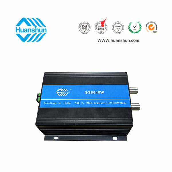 樓棟光接收機(jī)GS8640W 47~860MHz,-7~+2dBm/RF 1×106或2×102dBuv,電調(diào)輸出電平和斜率均衡,外置 90~255V-12V 1A 電源適配器