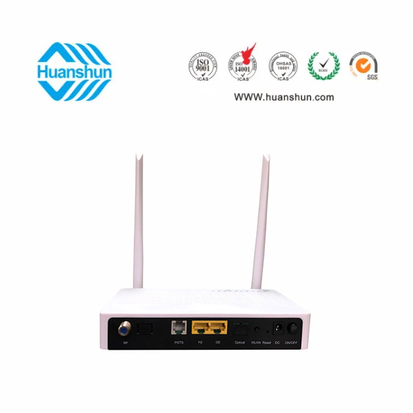 G/EPON ONU, PON端口接入,1GE+1FE網絡接口,1個POTS 2*2 2.4G WIFI(外置天線300米),CATV1540~1565nm -5~-15dBm inport/RFMD76dBuv恒定輸出,網絡管理監控光接收功率,RF輸出電平,RF on / off,通過內置WDM-PON xPON1310/1490nm1~4dBmTX,-28dBmRX連接到xEPON;外置90~255V-12V 1A電源適配器